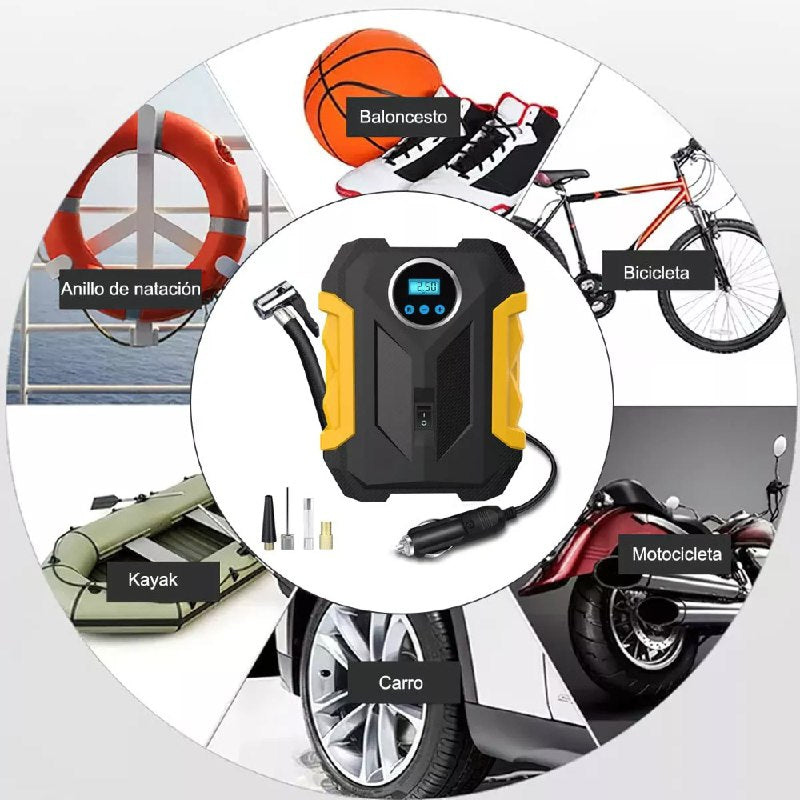 Está equipado con una manguera flexible y múltiples boquillas que lo hacen compatible con diferentes tipos de válvulas. Su pantalla digital integrada permite monitorear la presión con precisión y ajustar el nivel deseado antes de inflar, garantizando resultados seguros y exactos.